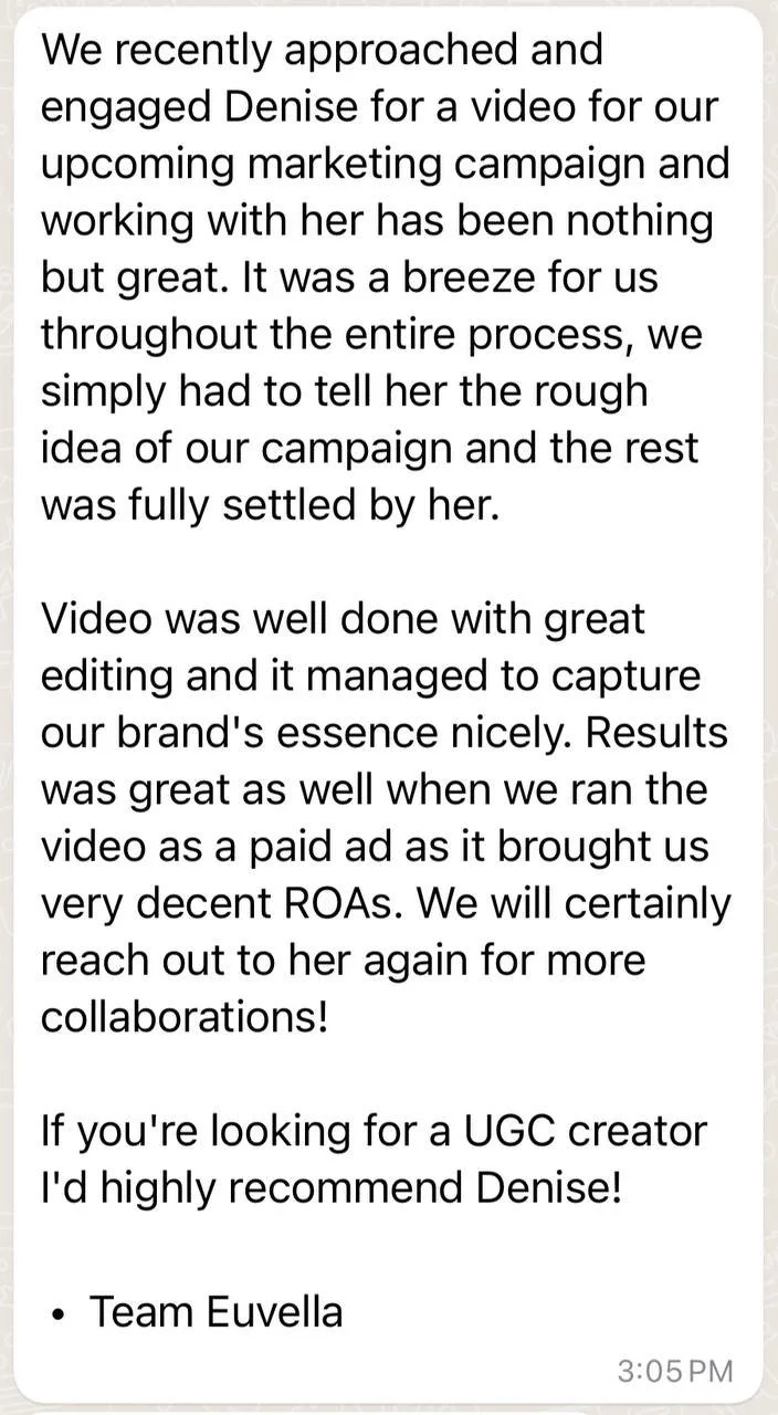 I’m a nicheless UGC creator based in Singapore, with an eye for clean, luxurious aesthetics. My content blends premium visuals with authenticity and is designed for conversions— perfect for brands looking to elevate their image while staying relatable.